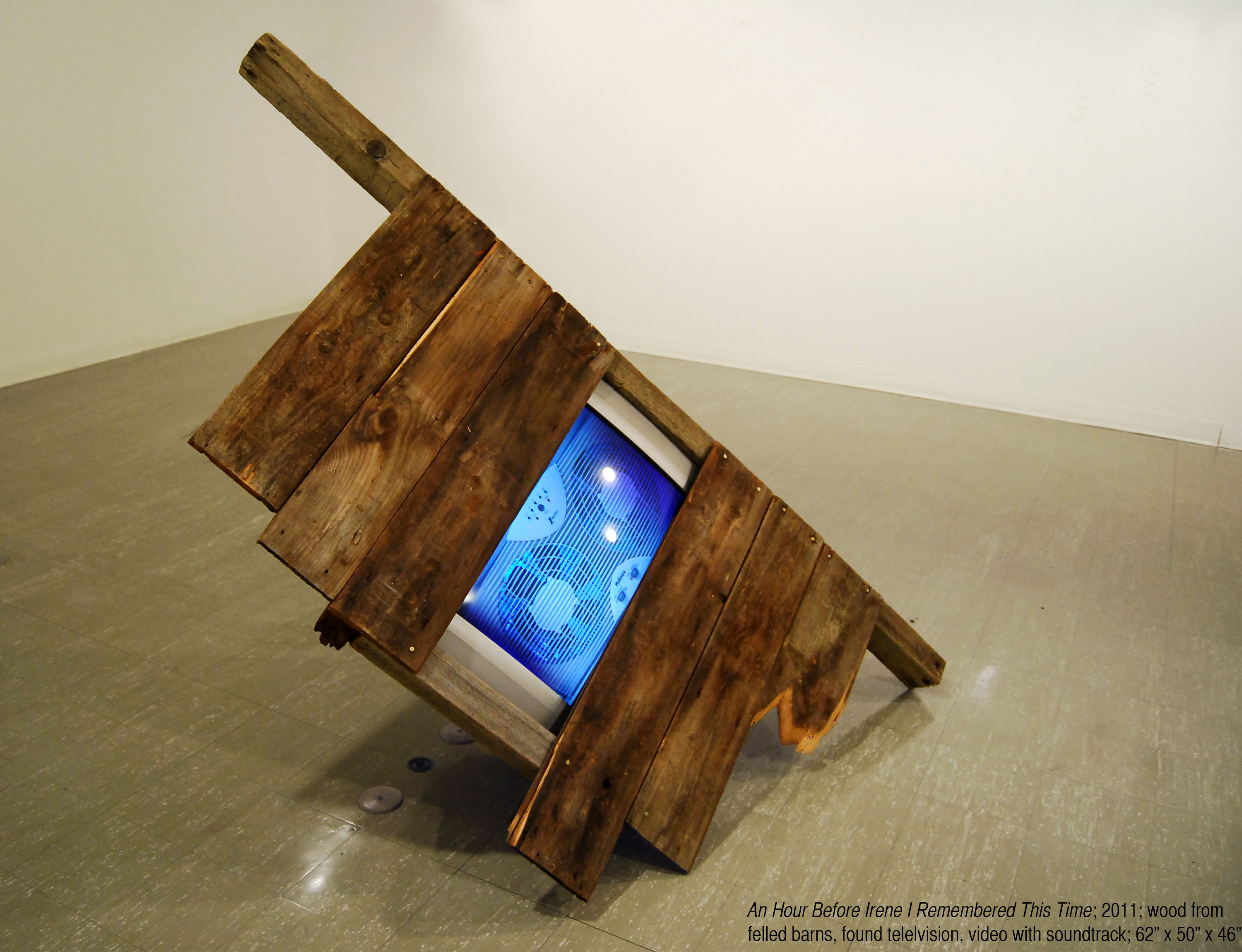| An Hour Before Irene I Remembered This Time; 2011; reclaimed barn wood, reclaimed television, captured video with superimposed tracks playing “It Must Have Been Love” by Roxette and “Keep On the Sunny Side” by the Carter Family; 52″ x 47″ x 43″ |