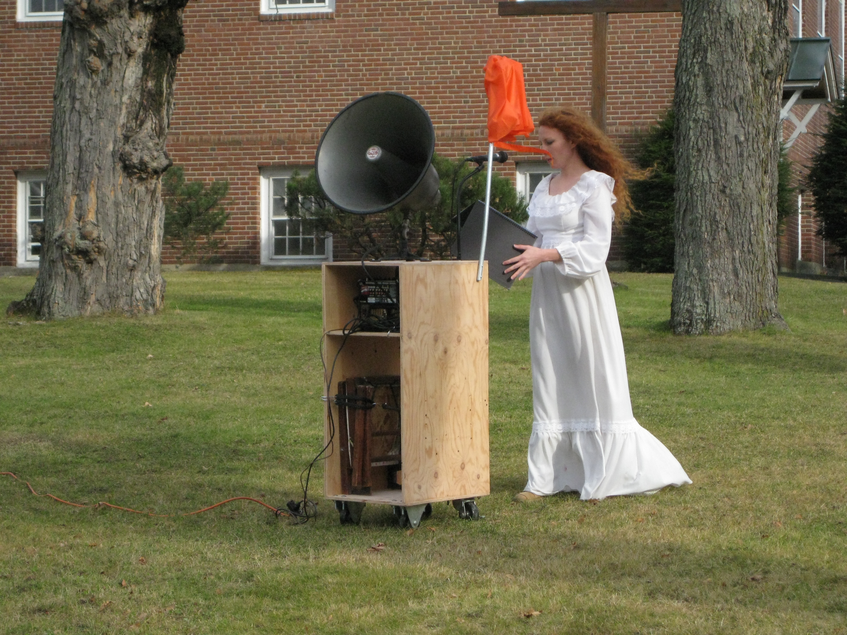 | Here’s One Way to Say; 2009; public performance in Farmington, ME, PA system, plywood, church bells, costume, mix media; dimensions variable, run time approximately 25 minutes |