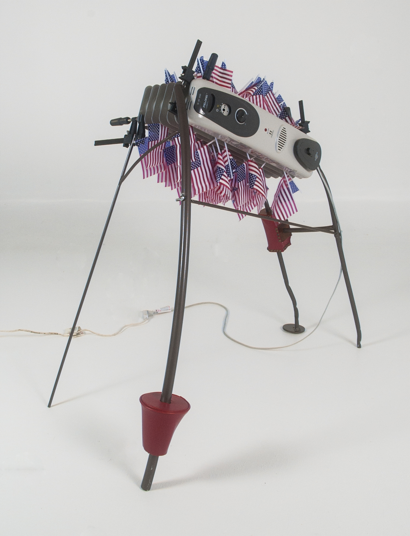 | Confluence of Marching Hearts; 2014; found space heater, 200 American flags, steel upholstered cherry wood, LED light and 555 circuit, mixed media; 50″ x 30″ x 41″ |